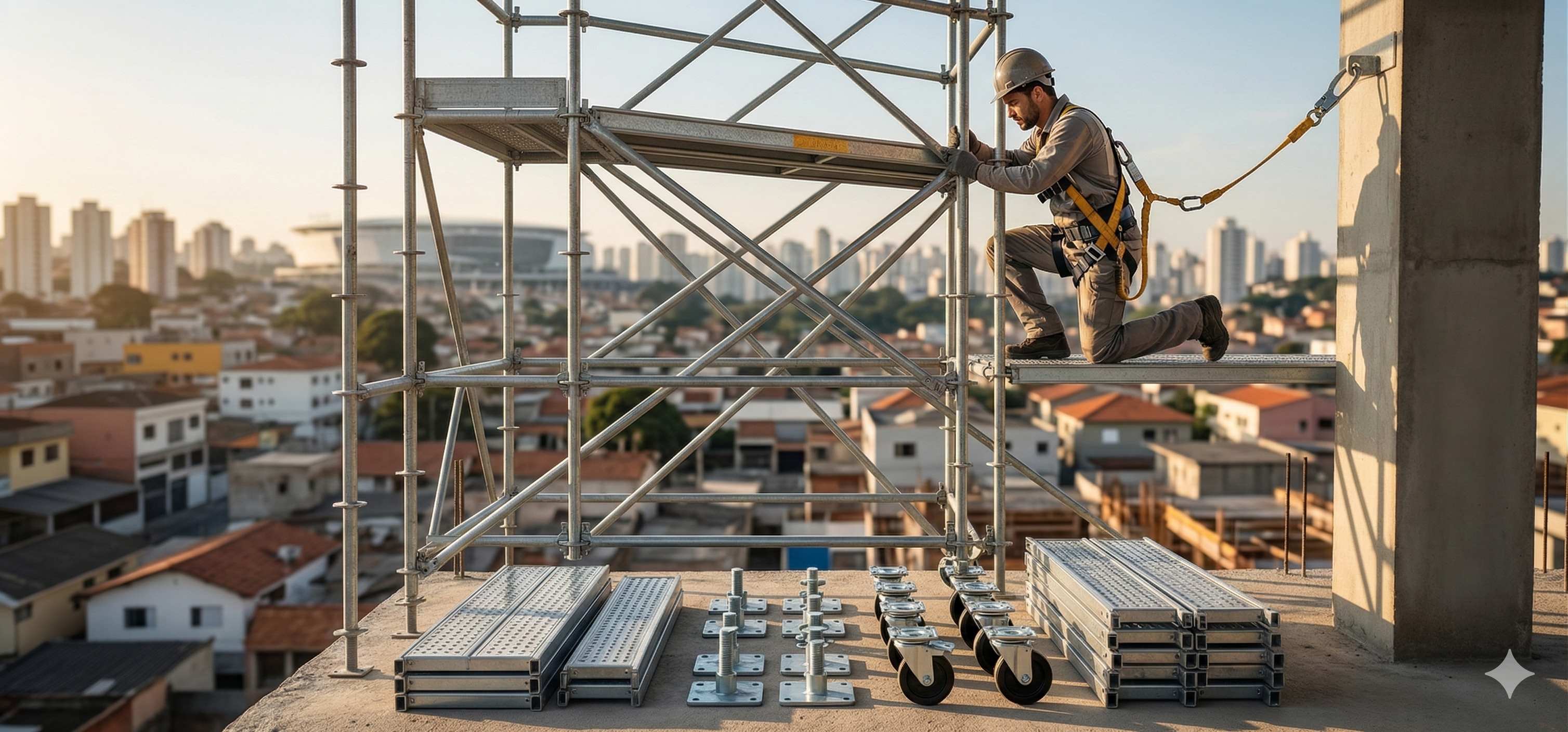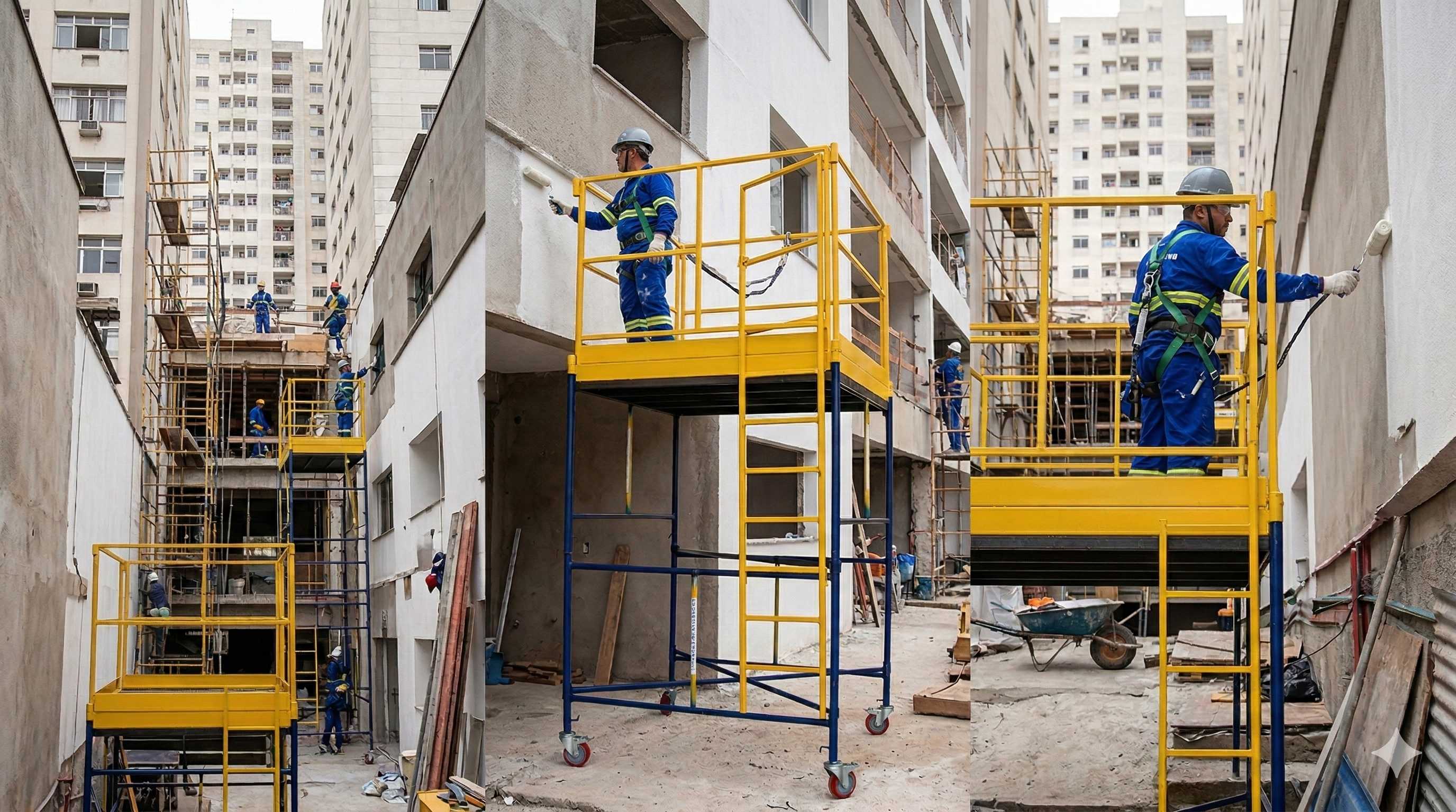 Andaimes montados seguindo as normas de segurança do trabalho, garantindo proteção para sua equipe.